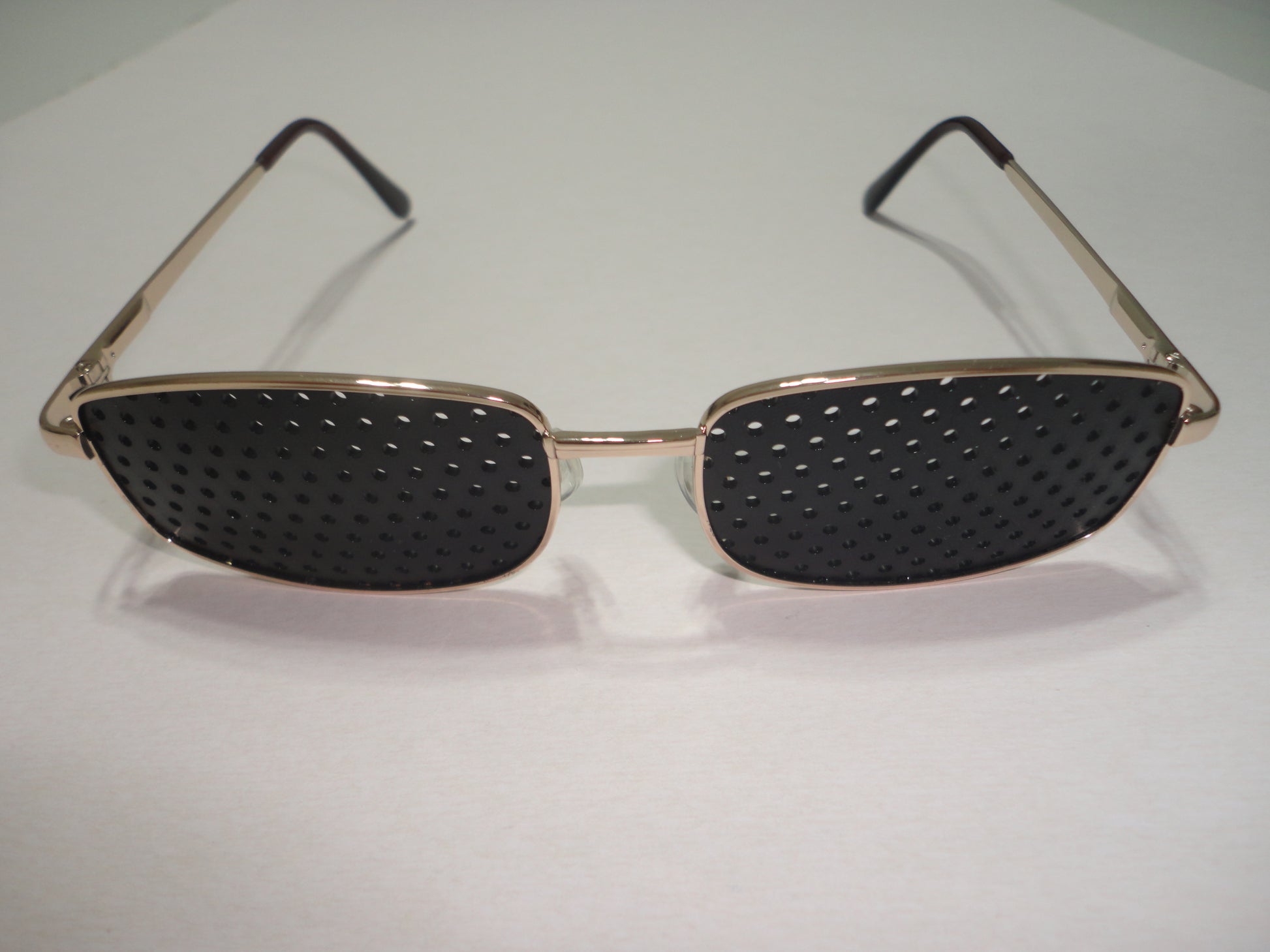 Metallic pinhole glasses with round holes. They are a little less wide than other metal glasses. Suitable for all symptoms between 0 and 4 diopters.